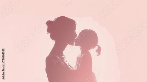 Minimalist illustration of a mother and child silhouette on a soft blush pink background, love and Mother's Day concept.
