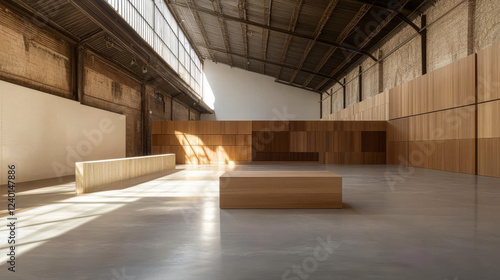Minimalist interior design in an industrial space with wooden panels and sunlight