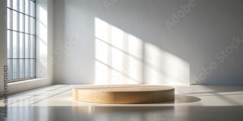 Minimalist interior scene with a circular wooden display platform bathed in sunlight