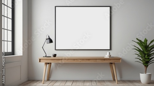 Minimalist Interior with Blank Framed Artwork and Wooden Desk