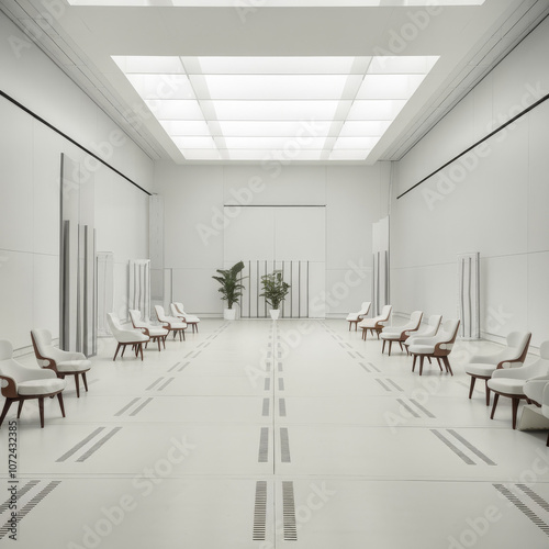 Minimalist interior with chairs and bright lighting. Futuristic and modern photography in a white clean setting.