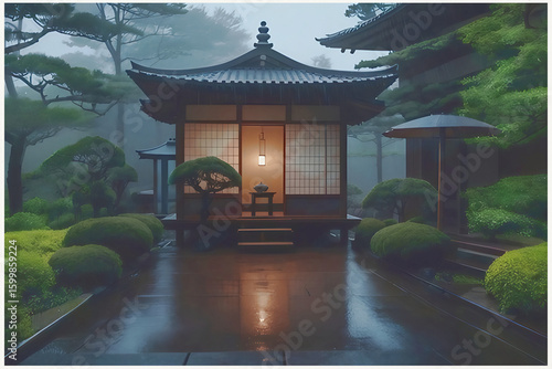 "Minimalist Japanese Tea House in Rainy Blue Hour (AI-Assisted )