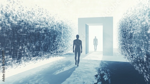 Minimalist Japanese woodblock print-inspired virtual reality scene, simplified human silhouette stepping through a geometric portal of pixelated light, illustration