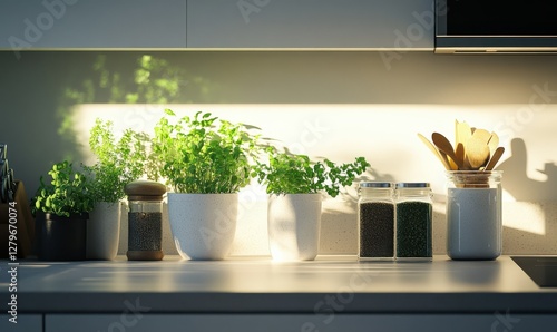 Minimalist kitchen counter with ceramic jars and fresh herbs arranged neatly illuminated by soft natural sunlight creating a clean and modern cooking space