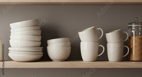 Minimalist Kitchen Shelf Stacked Bowls, Mugs, and Grain Jar in Soft, Neutral Tones for Home Decor