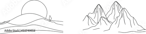 landscape, mountain, hill, sunset, sunrise, sun, nature, line art, black-and-white, illustration, vector, minimalist, simple, outline, graphic, design, scenery, travel, adventure, vignetting, terrain, silhouette, environment, outdoors, calm, serene, isolated, scenic, artwork, monochrome