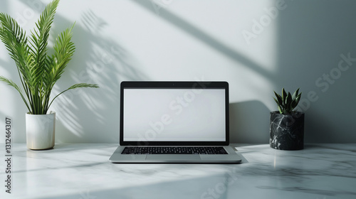 Minimalist laptop with blank screen on a marble desk with indoor plants