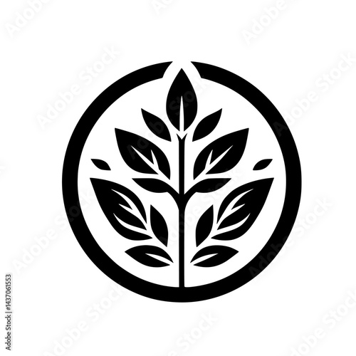 Minimalist Leaf Emblem in Circle, Black and White, Nature Logo