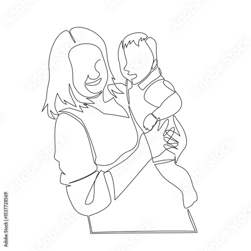 Minimalist line drawing of a mother holding her baby toddler child, showing warmth and affection. Great for motherhood, childcare, love, and family topics on transparent background