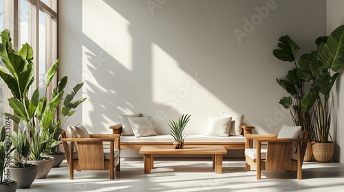 Minimalist living room with a wooden couch and chairs, decorated with tropical plants.
