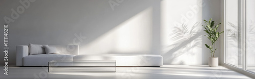 Minimalist living room with muted gray tones, a large glass coffee table, and plenty of sunlight filtering in
