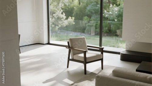 Minimalist living room with wooden armchair and large glass windows overlooking greenery