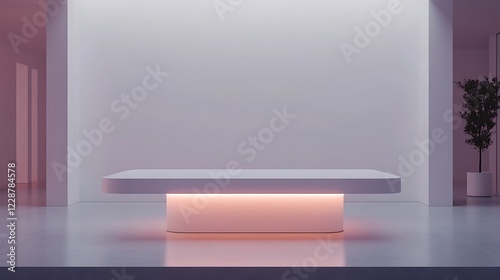 minimalist, modern, illuminated, display, table, design, interior, architecture, room, space, white, pink, light, glow, sleek, clean, simple, elegant, subtile, contemporary, aesthetic, showcase, product, presentation, platform, racked, footed, support, structure, form, shape, line, angle, smooth, texture, surface, floor, wall, plant, pot, empty, blank, background, style, ambience