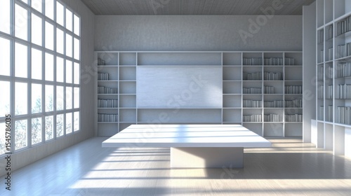 minimalist, modern, library, interior, design, bookshelf, book, concrete, sunlit, roomy, clean, simple, elegant, bright, airy, calm, serene, peaceful, tranquil, contemporary, style, architecture, home decor, room, office, study, reading, relaxation, comfort, light, shadow, aesthetic, neutral, monochrome, presentation