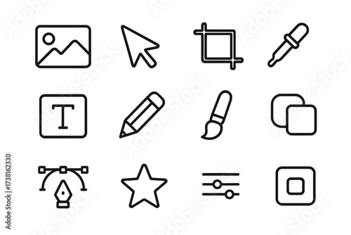 icon, set, design, editing, tool, vector, graphic, symbol, interface, outline, minimalist, line, simple, pictogram, collection, web, app, software, pen, crop, text, brush, cursor, pointer, eyedropper, crayons, layer, image, star, setting, adjustment, slider, shape, buttons, element, signs, website, application, digital, illustration, editable, stroke, isolated, clean, modern