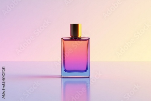 perfume, bottle, minimalist, gold, cap, gradient, pink, orange, blue, purple, sunset, beauty, cosmetic, fragrance, product, still life, square, glasses, elegant, luxury, clean, simple, modern, design, background, pastel, colours, texture, surface, shiny, reflective, light, shadow, smooth, style, fashion, beauty product, aromatherapy, smell, scent, feminine, sophisticated, premium, vibrant, subtile, contemporary, minimal, scene