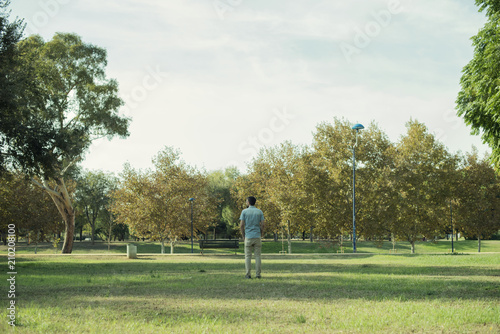 Minimalist portrait of man with his back to the distance in the middle of a landscape of a park or forest with many green trees and a large expanse of grass.