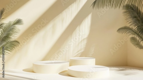 Minimalist product display podiums, sunlit room, palm leaves, studio background