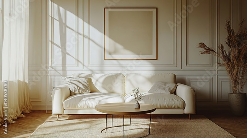 Minimalist Scandinavian living room featuring a cozy sofa and round coffee table