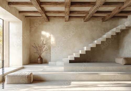 minimalist, scandinavian, loft, empty, room, concrete, wall, wooden, beam, nature, view, calmness, natural, light, soft, shadow, modern, interior, design, architecture, elegant, comfortable, decoration, relaxation, contemporary, living, plank, ceiling, sunlight, garden, tropical, green, villa, apartment, home, bright, simple, concept, three-dimensional, render, background, style, copy, space, floor, house
