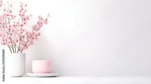 spring, cherry, blossom, pink, floral, vase, decor, aesthetic, minimalist, modern, simple, home, interior, design, white, background, still, life, pastel, cosy, peaceful, calm, zen, japanese, nature, beauty, art, three-dimensional, rendering, illustration, still life, living room, bedchamber, office, studio, clean, elegant, pretty, flower, arrangement, display, light, contemporary