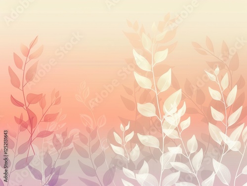 Minimalist shadow pastel background with delicate abstract foliage silhouettes against a gradient of pastel coral, lilac, and cream rough edges.