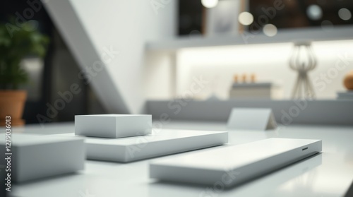 Minimalist showcase: geometric white shapes arranged on a reflective surface in a bright, modern setting.