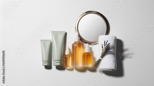 skincare, beauty, product, minimal, lavandula, towel, mirror, vintage, cosmetic, bottle, tube, serum, oil, dropper, white, background, clean, simple, arrangement, spa, wellness, hygiene, routine, treatment, aromatherapy, essential, natural, organic, herbal, floral, relaxation, health, lifestyle, still life, nobody, copy space, blank, container, package, design, elegant, aesthetic, modern, contemporary, neutral, pastel