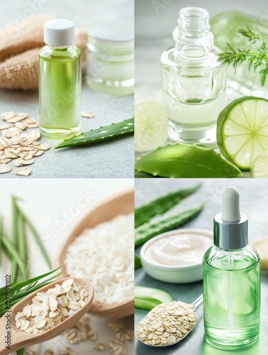Minimalist Skincare Collage Eco-Friendly Bottles with Aloe and Oats for Glowing Skin - Sustainable Beauty Content in Modern Wellness and Green Marketing