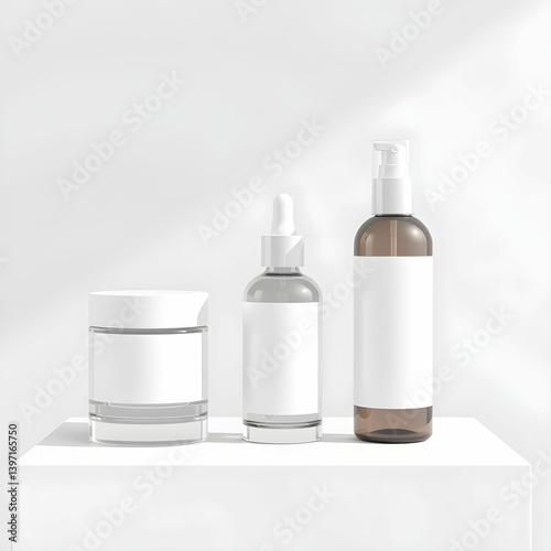 minimalist skincare set, white background, clean aesthetic, cosmetic bottles, spray bottle, cream jar, product photography, muted tones, simple composition, 3D rendering, high-end beauty products