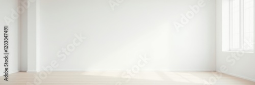 Minimalist studio space with white wall, wooden floor and large window , empty, space