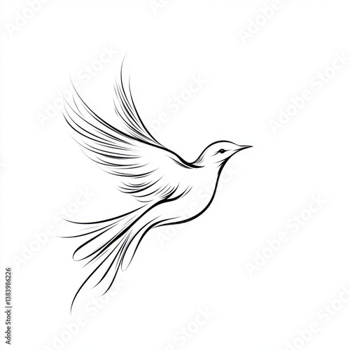 Minimalist tattoo of a flying bird in motion, one continuous line, black vector-style, isolated on white background