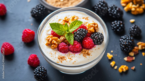 Minimalist top view of a macro-balanced greek yogurt bowl with fresh berries and walnuts. Concept of a healthy, high-protein breakfast for clean eating, wellness, and a fitness diet.
