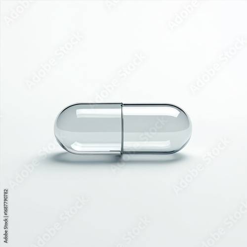 Minimalist transparent medical capsule isolated on white. Gelatin, three-dimensional object representing health, medicine, pharmacy. Clean, empty capsule for vitamins, supplements, pharmaceuticals.