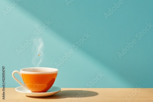 Minimalist Wellness Moment Single Tear Dropping into Vibrant Orange Cup on Wooden Table with Soft Steam - Emotional Content for Mindfulness Marketing and Sustainable Cafe Design