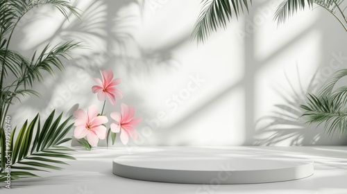 flower, pink, white, background, minimal, dais, product, display, floral, tropical, green, leaf, palm, shadow, light, studio, clean, simple, elegant, nature, beauty, style, design, decor, soft, bright, fresh, summer, pastel, modern, aesthetic, abstract, composition, graphic, illustration, three-dimensional, render