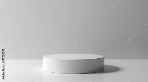 Minimalist white cylindrical pedestal on a white table against a grey background, perfect for product display or showcasing items.