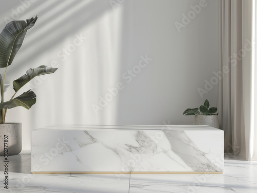 Minimalist White Marble Podium, front view focus, with a Clean Scandinavian Living Room Background