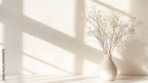 Minimalist white vase with dried flowers and soft shadows, space for text