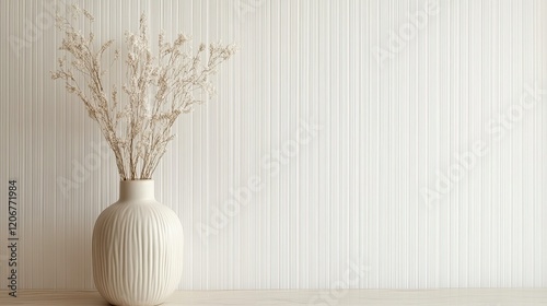 Minimalist White Wallpaper with Vertical Lines and Dried Flowers