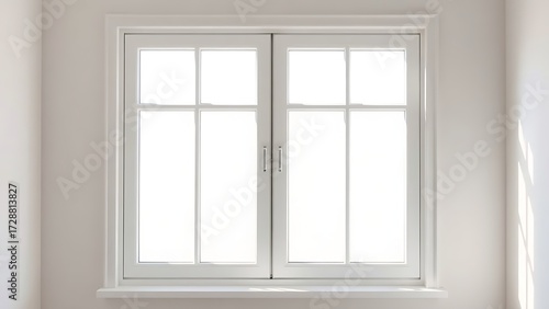 Minimalist white window frame with translucent panels filtering soft daylight.