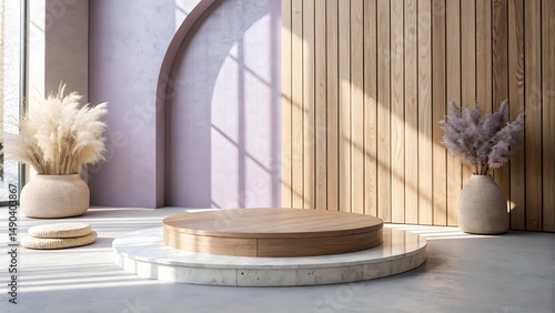 Minimalist Wooden Product Display Platform with Dried Flowers