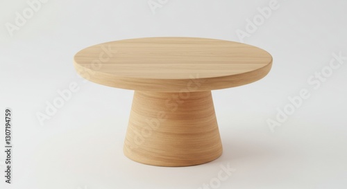 Minimalist wooden table with a round top and cylindrical base on a white background