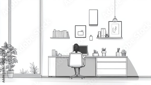 workspace, office, minimalism, desk, computer, work, productivity, home office, interior, design, plant, shelf, book, window, chair, decor, note, organisation, light, contemporary, indoor, table, relaxation, sharpened, creativity, surrounding, professional, comfortable, aesthetic, line, drawing, simplicity, space, arrangement, ambience