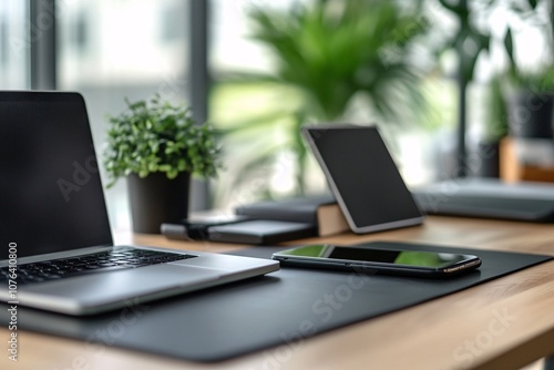 desk, office, workspace, laptop, technology, work, productivity, modern, minimal, clean, organised, business, professional, digital, electronic, tablet, smartphone, screen, keyboard, mouse, plant, green, natural, light, wood