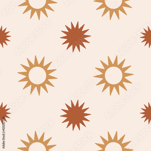 Minimalistic abstract seamless pattern with geometric stars on pastel background. Bohemian pattern for wallpaper, textile, fabric, interior design. Modern vector illustration. Terracotta colors