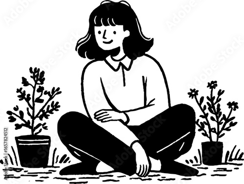 Minimalistic black and white illustration of a girl sitting with plants in a garden scene