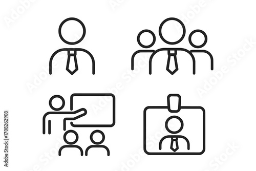 Minimalistic Business and Team Icons Set. Simple Line Art of Leader, Group, Presentation, and ID Badge Symbols for Web, Apps, Social Networks, Banners, and Corporate Design with Transparent Background