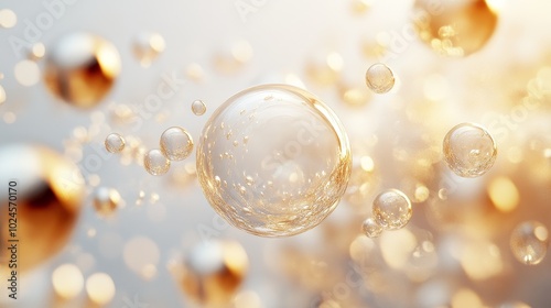 Minimalistic Design with Gold Bubbles on White Background, Soft Lighting and Depth of Field Creating a High-End, Elegant Aesthetic with Exquisite Details