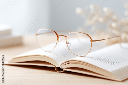 minimalistic desk with open book and eyeglasses on light wooden surface